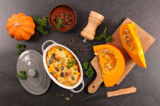 Un délicieux parmentier de canard au potiron, carottes et pommes de terre, parfumé à l'huile de noisette et au gros sel aromatisé Thym Laurier et Baies roses.