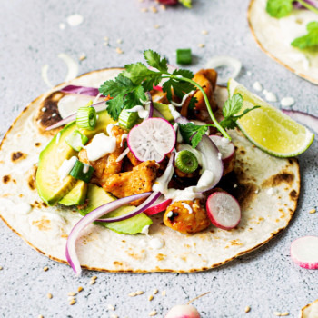 Assemblez les tacos en plaçant le poulet grillé, l'avocat, l'oignon rouge et les tranches de radis sur les tortillas.